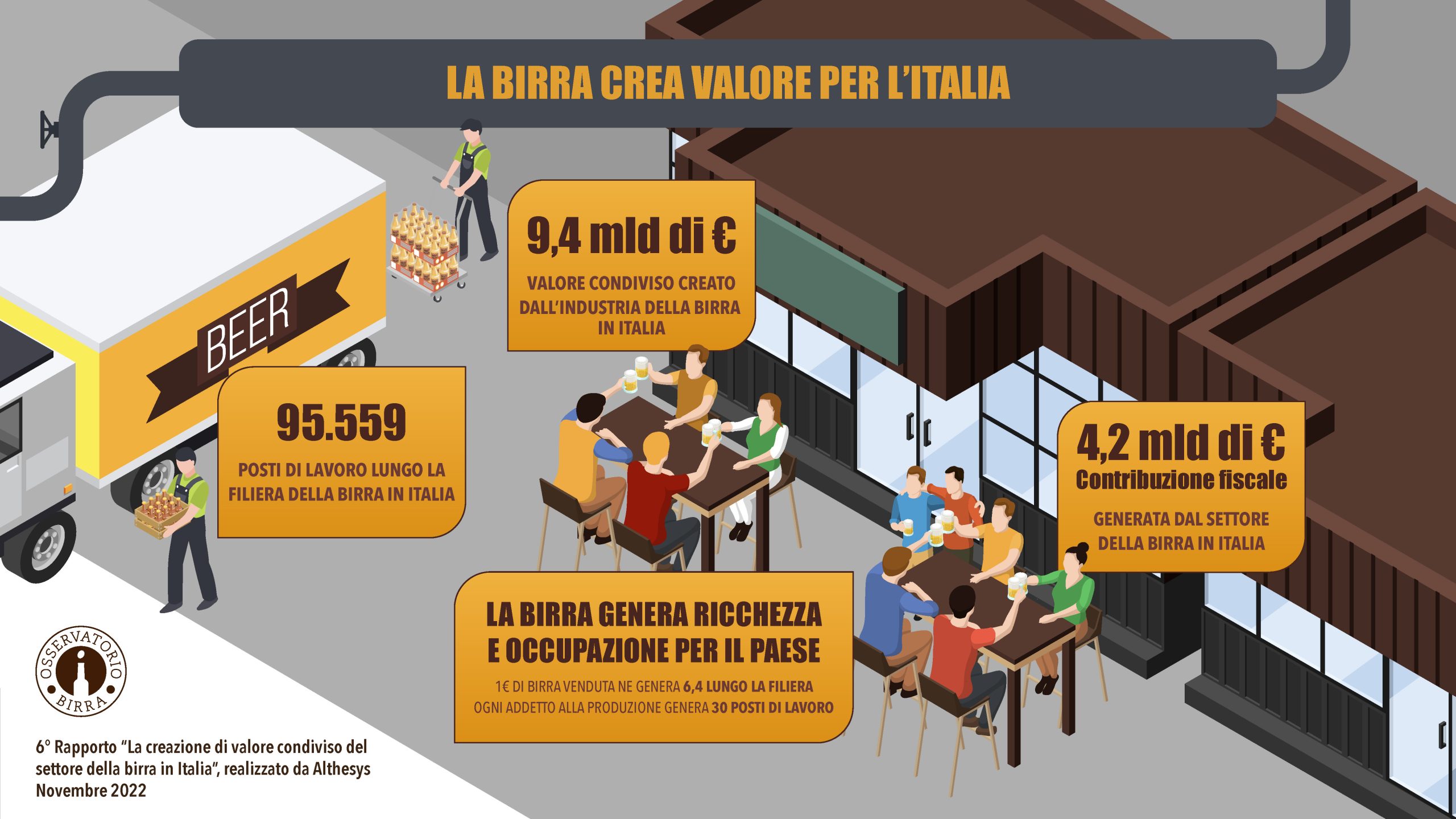 Secondo lo studio di Osservatorio Birra, la filiera della birra nel 2021 ha generato 9,4 miliardi di euro di valore condiviso, che corrispondono a mezzo punto percentuale (0,53%) del nostro PIL e al 5% dei fondi previsti dal PNRR.